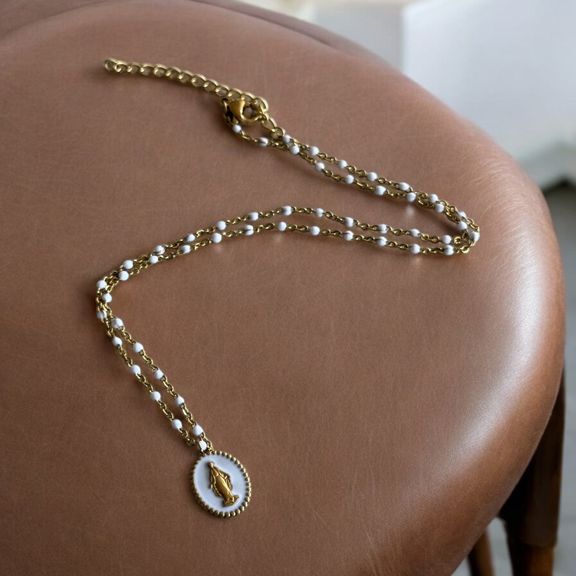 Colgante de acero dorado con detalle de bolitas emaltadas en la cadena en color blanco, a juego con la medalla de la Milagrosa, también esmaltada en blanco. Sin duda, una combinación elegante y delicada perfecta para llevar con tus looks del día a día.