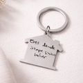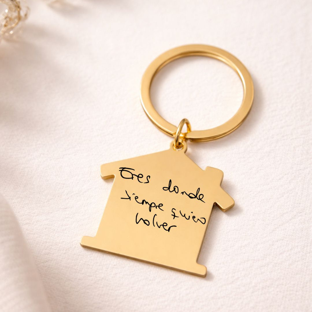 Este llavero con forma de casa convierte un texto manuscrito real —el tuyo— en un grabado permanente. No es una tipografía. No es una fuente bonita. Es tu letra, con sus imperfecciones, su personalidad y su verdad.