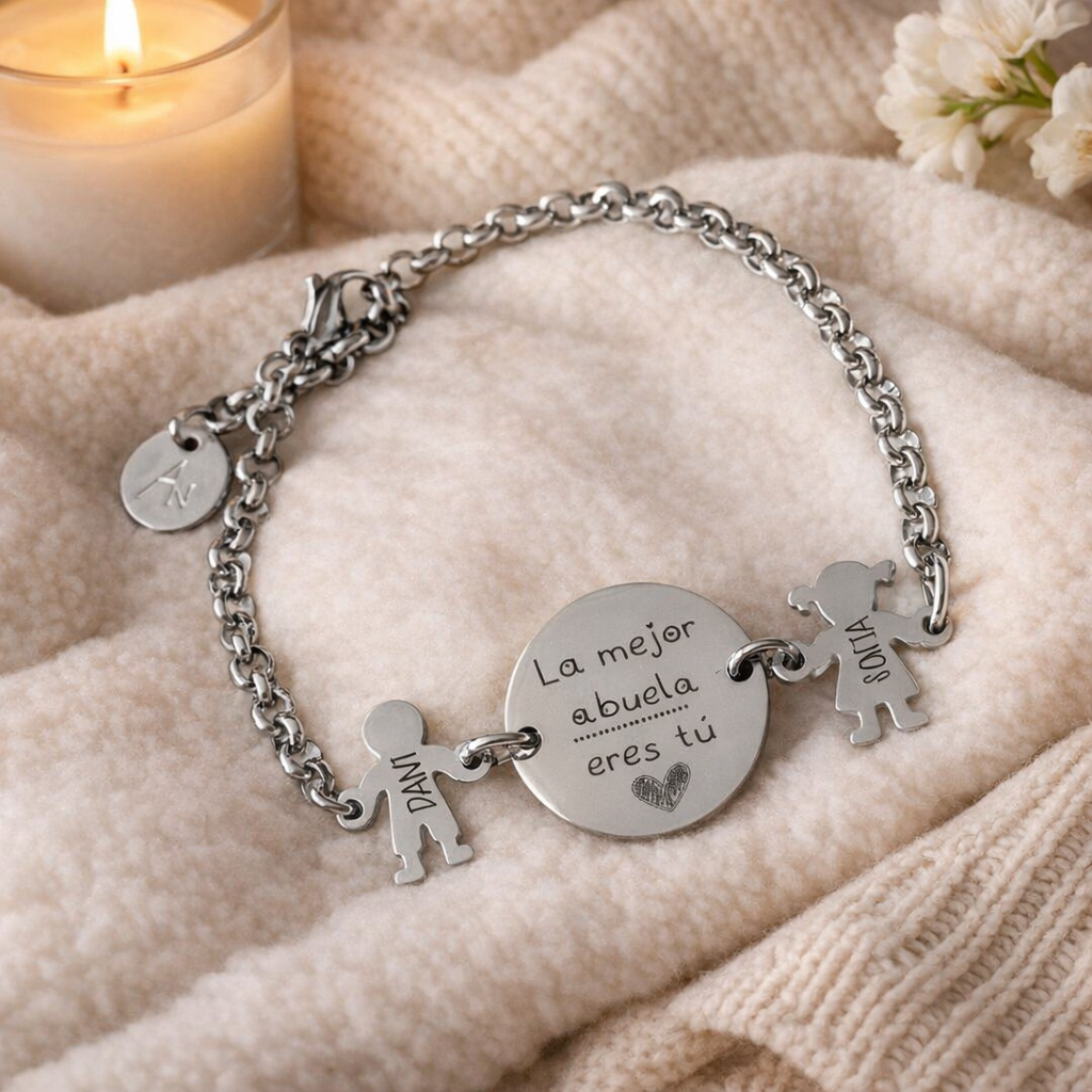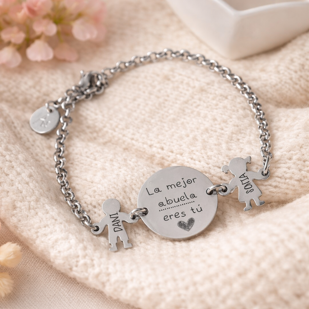 En el centro de la pulsera destaca una delicada medalla grabada con el mensaje “La mejor abuela eres tú”, una frase sencilla pero cargada de emoción, capaz de arrancar una sonrisa cada vez que la mire. A ambos lados, pequeños muñequitos de niño y niña representan a sus nietos, convirtiendo esta joya en un recuerdo único y profundamente personal.